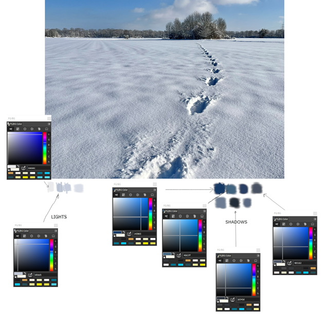 Les couleurs des ombres sont bleus de forte valeur. La saturation de la couleur varie. Plus on est au fond de l’empreinte plus le bleu est saturé.